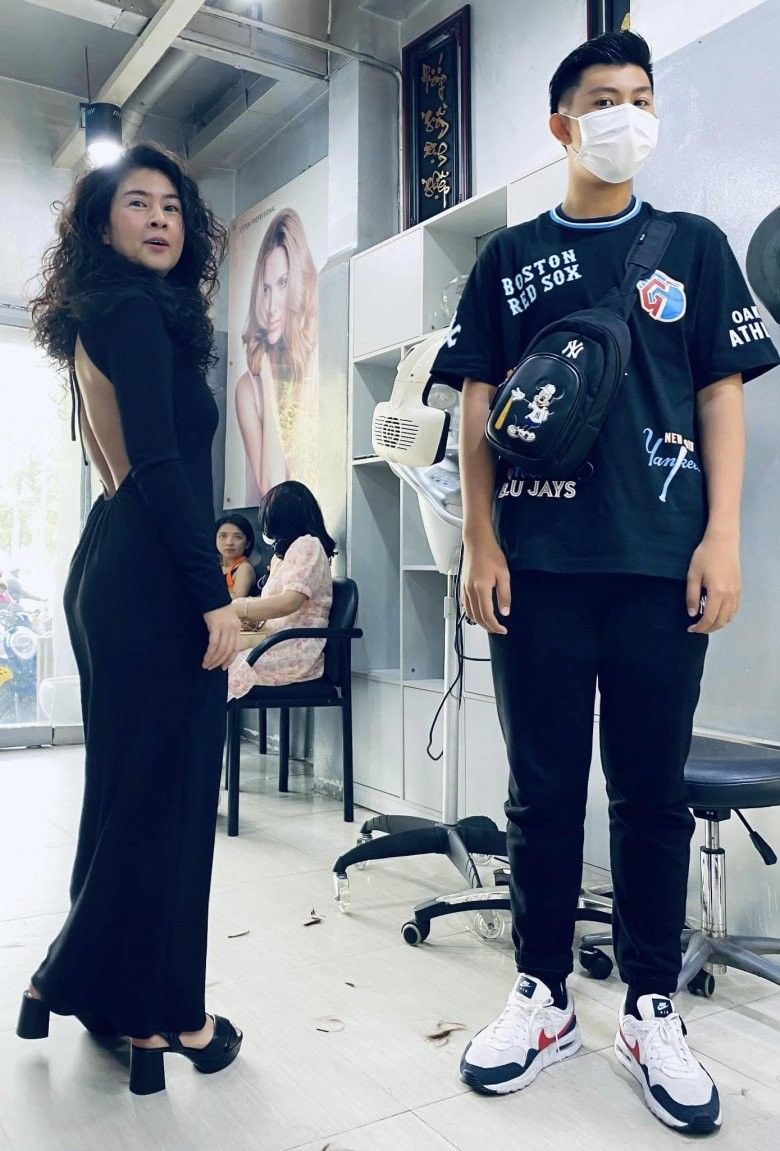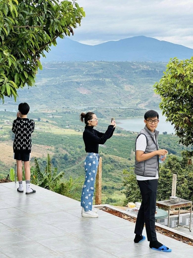 Kim Thư mang giày cao gót mà vẫn chưa cao bằng hai con trai của mình.