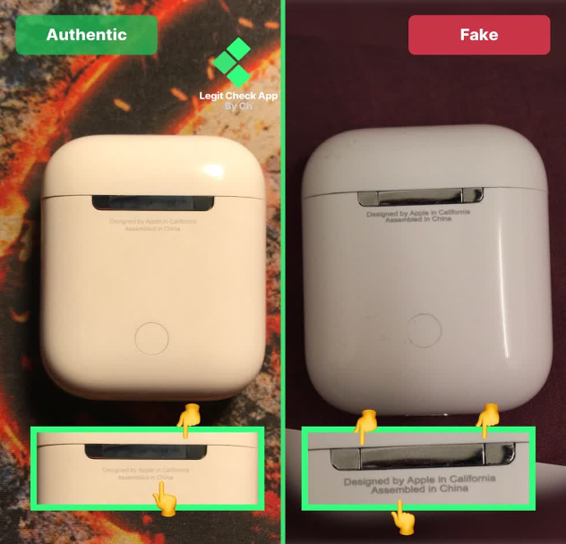 – Về ngoại hình: tai nghe nhái (fake) đa phần đèn led nằm ở ngoài hộp chứ không nằm ẩn trong phần hộp, nút bấm phía sau hộp sạc (case) khá lỏng lẻo và khó bấm. Phần bản lề của hàng nhái khi nhìn sẽ không bóng bẩy như của hàng thật.