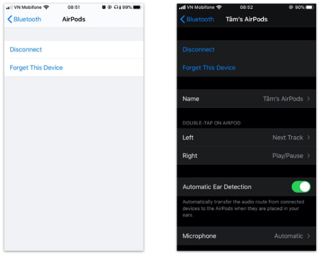 – Về kết nối: tai nghe nhái (trái) chỉ hiển thị như một thiết bị Bluetooth còn tai nghe thật (phải) có các tùy chọn như đổi tên, chạm gõ bên trái, chạm gõ bên phải, chọn Micro cho mỗi tai.