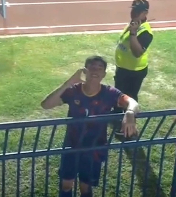 Trên khán đài, một bóng hồng đặc biệt được chú ý chính là bạn gái của Quan Văn Chuẩn. Sau trận đấu, chàng thủ môn ngay lập tức đi tìm bạn gái và không ngần ngại thể hiện động tác ngọt ngào khi “thả tim” cho người đẹp. Ngồi trên khán đài, Hà Dương – bạn gái Văn Chuẩn – đeo khẩu trang vì không muốn để lộ mặt trước ống kính.