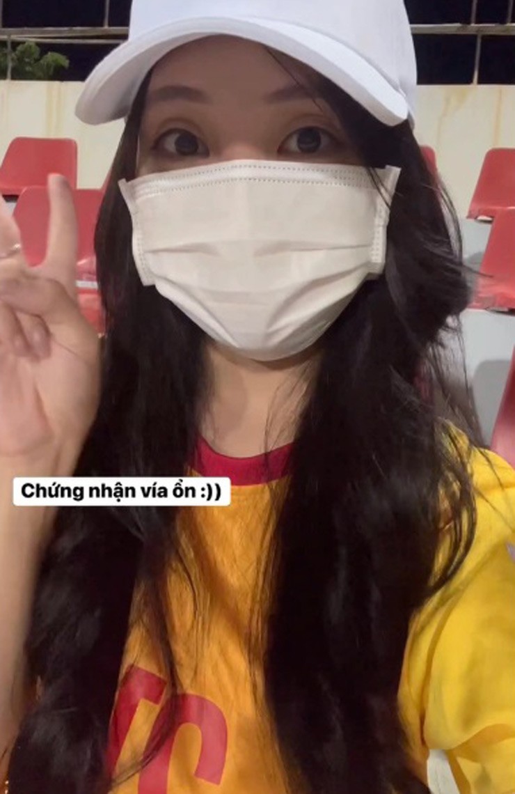 Hà Dương ngồi trên khán đài cổ vũ, đeo mũ lưỡi trai và bịt khẩu trang che mặt nhưng vẫn cho thấy thần thái tươi vui