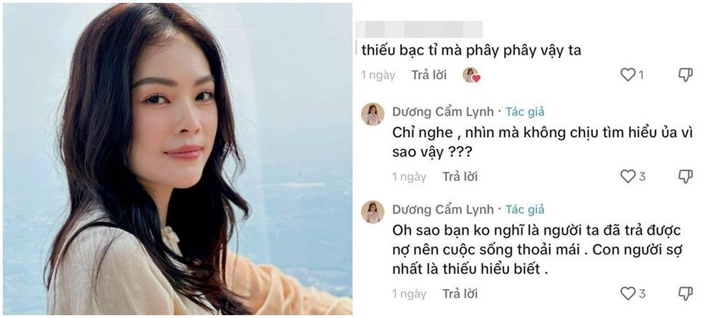 Không ngại ngần, Dương Cẩm Lynh đã thẳng thắn đáp trả lại: “Chỉ nghe, nhìn mà không chịu tìm hiểu. Vì sao vậy? Sao bạn không nghĩ người ta trả được nợ nên cuộc sống thoải mái. Con người sợ nhất là thiếu hiểu biết”. Nữ diễn viên cho biết bản thân đang nỗ lực chạy show và bán hàng online để kiếm tiền trả hết phần nợ còn lại.