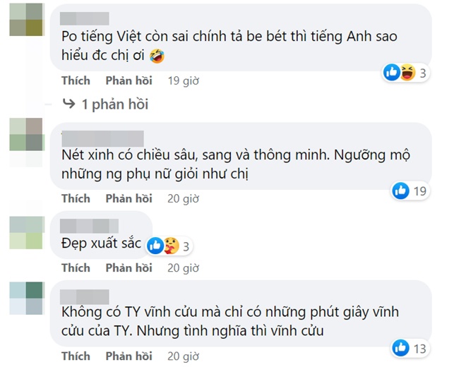 Một vài bình luận khác nhắc đến chuyện tình cảm của nữ doanh nhân: “Không có tình yêu vĩnh cửu mà chỉ có những phút giây vĩnh cửu của tình yêu. Nhưng tình nghĩa thì vĩnh cửu”, “Ai rồi cũng sẽ khác theo tháng năm dần trôi, yêu đương mấy cũng buông khi người ta thay lòng”, “Cứ vô tư tận hưởng những thành tựu của mình em nhé. Chuyện thị phi vứt vào thùng rác em ạ”…