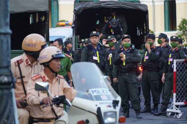 Từ sáng sớm, an ninh khu vực toà án được thắt chặt. Nhiều lực lượng công an phối hợp bảo vệ trật tự tại đây như CSGT, CSCĐ…