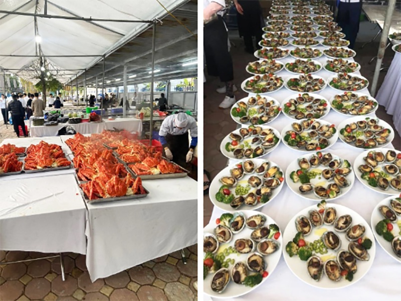 Thực đơn bữa tiệc cưới gây ‘choáng’ với những món ‘sơn hào hải vị’ như cua hoàng đế, bào ngư, cá hồi áp chảo, trâu chao vừng.