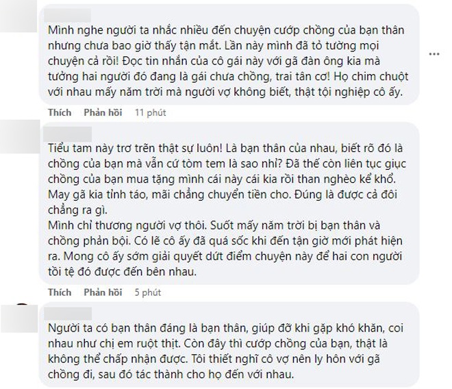 Mình chỉ thương người vợ thôi. Suốt mấy năm trời bị bạn thân và chồng phản bội. Có lẽ cô ấy đã quá sốc khi đến tận giờ mới phát hiện ra. Mong cô ấy sớm giải quyết dứt điểm chuyện này để hai con người tồi tệ đó được đến bên nhau”, bạn H.V bức xúc.