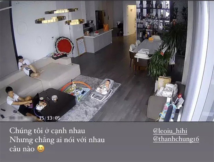 Trên Story Instagram cá nhân, hot girl Ngô Tố Uyên – vợ cầu thủ Thành Chung – gây chú ý khi đăng tải đoạn trích từ camera một buổi chiều bình thường của gia đình. Trong khi con nằm trên nôi, cô và chồng cầu thủ mỗi người một góc sô pha, ai làm việc nấy. “Chúng tôi ở cạnh nhau nhưng chẳng ai nói với nhau câu nào”, cô hài hước chia sẻ.