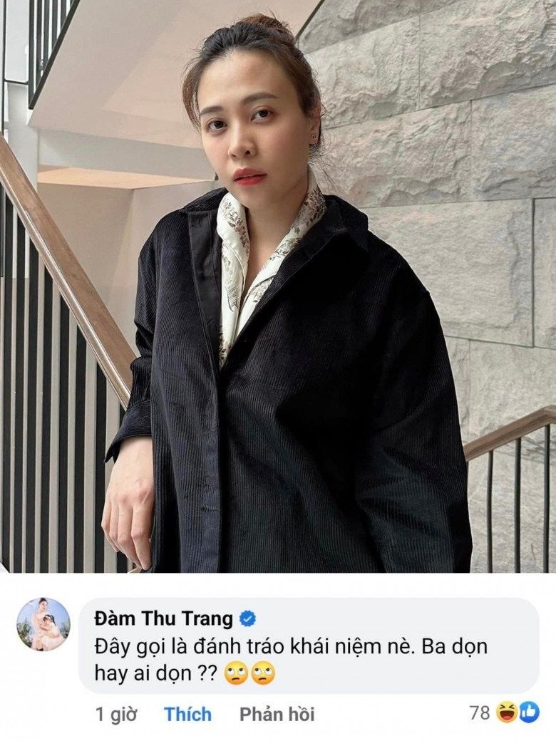 Cố gắng “lấy lòng” vợ thế nhưng Cường Đô La không “qua mắt” được bà xã. Ngay bên dưới bình luận, người đẹp Đàm Thu Trang đã “bắt bẻ” chồng: “Đây gọi là đánh tráo khái niệm nè. Ba dọn hay ai dọn?”