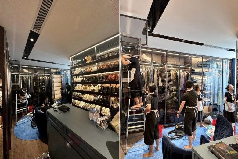 Dù chỉ hé lộ một góc nhỏ nhưng có thể thấy, không gian căn phòng quần áo rộng rãi, gồm nhiều tủ kính trưng bày quần áo, giày dép đến từ những thương hiệu đắt đỏ. Đáng chú ý, trong bức ảnh chụp của ông xã Đàm Thu Trang, có hẳn 5 người giúp việc đang sắp xếp, dọn dẹp căn phòng này.