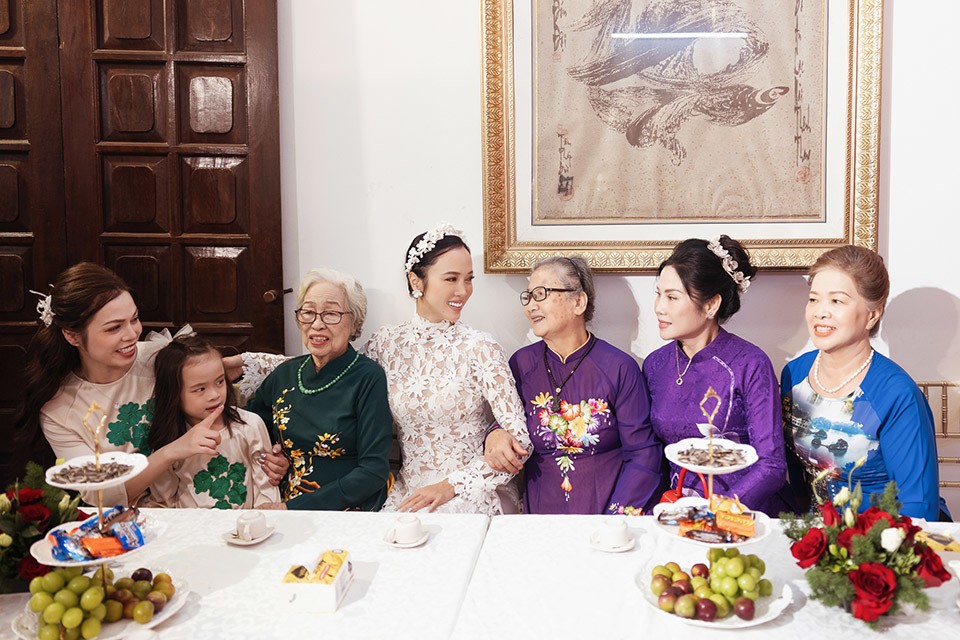 Vũ Ngọc Anh rạng rỡ bên các thành viên trong gia đình. Cô dậy từ sớm, tất bật chuẩn bị mọi công đoạn cho lễ rước dâu và tiệc cưới vào tối cùng ngày.