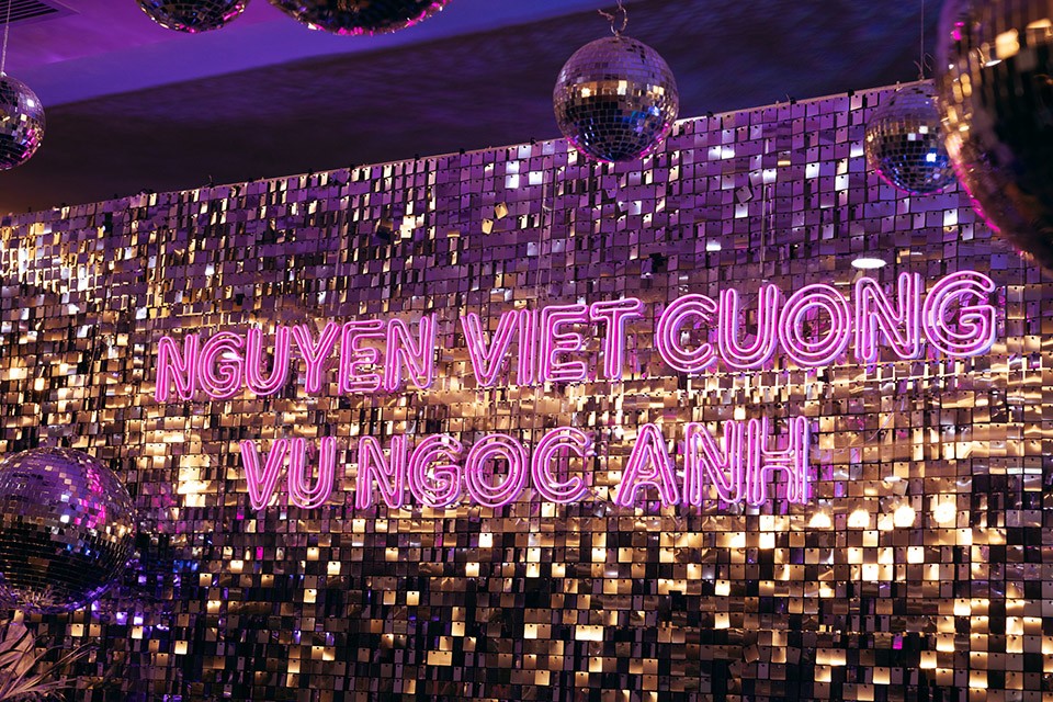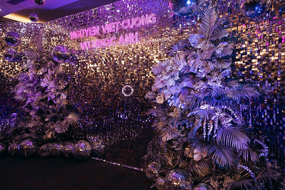 “Ý tưởng này đã được lên và chuẩn bị cách đây 4 tháng với hơn 100 quả cầu disco các kích cỡ trang trí khắp các khu vực sảnh tiệc. Ngoài ra, phần hiệu ứng 3D tông màu chủ đạo là bạc, hồng, xanh sẽ tạo điểm nhấn cho không gian”, Vũ Ngọc Anh nói