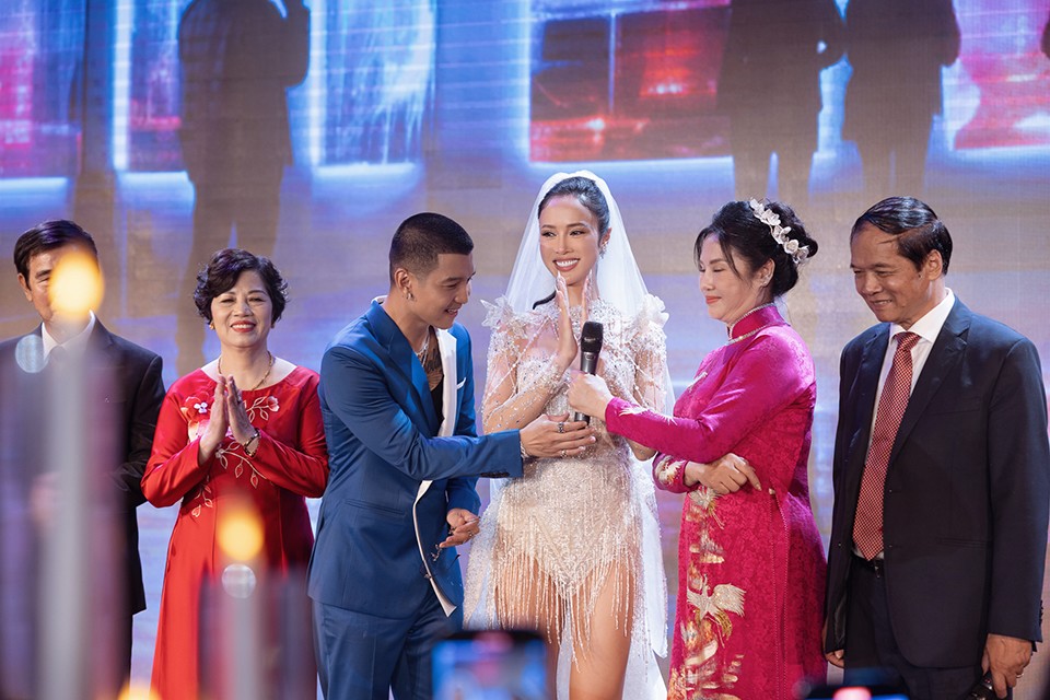 Khoảng 20 giờ, lễ cưới chính thức bắt đầu. Gia đình hai bên gửi những lời chúc tốt đẹp đến cô dâu, chú rể. Chuyện tình cảm của họ được bố mẹ ủng hộ và thấu hiểu.
