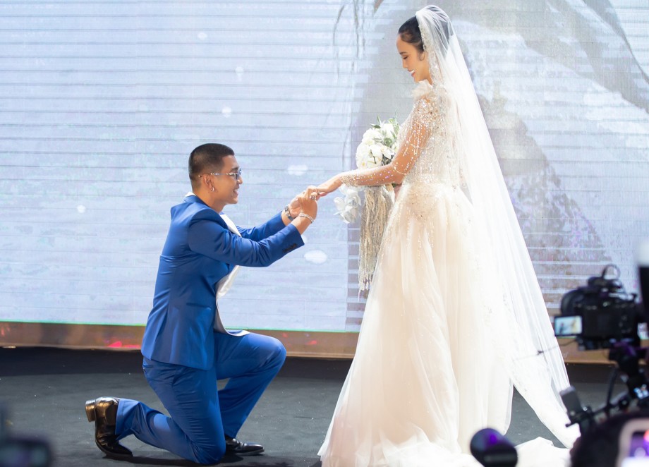 Cường Seven quỳ gối, trao nhẫn cưới cho vợ trong tiếng hò reo, chúc phúc của mọi người.