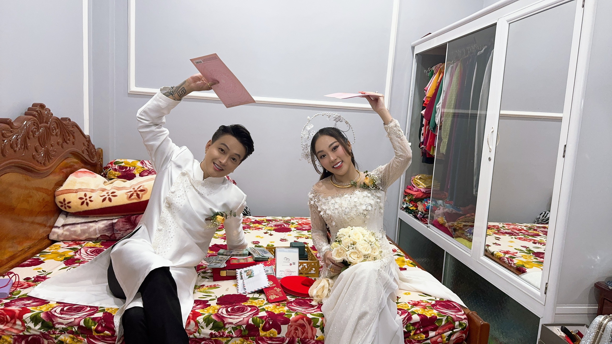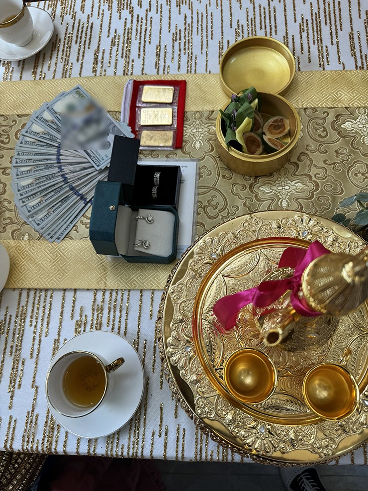 Sau màn phát biểu của gia đình hai bên, mọi người đều tập trung vào phần trao quà cưới, sính lễ cho cô dâu, chú rể. Nhà trai đã mang sính lễ gồm: bộ trang sức hột xoàn (dây chuyền, lắc, bông tai, cặp nhẫn), 3 cây vàng (khoảng 245 triệu đồng) và 10.000 USD (hơn 250 triệu đồng), đôi nhẫn cưới và các mâm quả khác đựng heo quay, bánh cưới, trái cây tươi… Trong khi đó, sính lễ nhà gái là 2 sổ đỏ, 10.000 USD và tiền mặt 200 triệu đồng.
