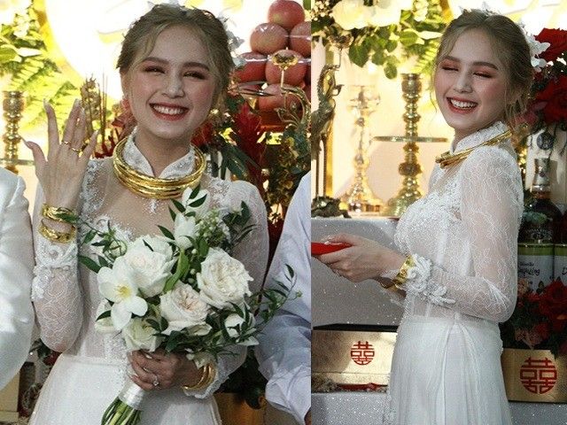 Hay hôn lễ của hotgirl Khánh Huyền và thiếu gia Bụt (Duy Nhỏ) vào đầu năm 2023, nàng dâu 19 tuổi đeo rất ít vàng dù bước chân vào gia đình hào môn. Thậm chí khi lên xe hoa về nhà chồng, hay các bức ảnh chụp cùng phù dâu phù rể, Khánh Huyền không đeo bất kỳ vàng vòng nào. Ở tiệc cưới, hotgirl sinh năm 2004 cũng không đeo trang sức mà chỉ đeo nhẫn cưới.