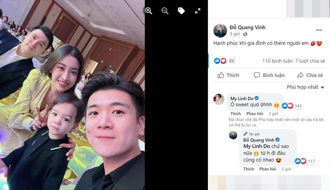 Đỗ Quang Vinh – anh chồng của Đỗ Mỹ Linh cũng từng đăng ảnh chụp cùng em trai, em dâu, chia sẻ vui vẻ: “Hạnh phúc khi gia đình có thêm người em”. Dưới phần bình luận, Đỗ Mỹ Linh bày tỏ sự bất ngờ: “Ỏ, sweet quá ợ” (“Ôi, ngọt ngào quá ạ”). Đỗ Quang Vinh liền đáp lời: “Chứ sao nữa, từ giờ đi đâu cũng có nhau” và được cô em dâu “thả tim” tức thì.