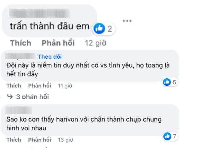 Trong rất nhiều bình luận khen ngợi nhan sắc Hari Won thì cũng có không ít người bày tỏ sự thắc mắc khi thấy vắng bóng Trấn Thành: “Sao không còn thấy Hari Won với Trấn Thành chụp chung hình với nhau?”, “Đôi này là niềm tin duy nhất có với tình yêu, họ toang là hết tin đấy”, “Anh Trấn Thành đâu chị?”, “Lẻ loi quá em”…