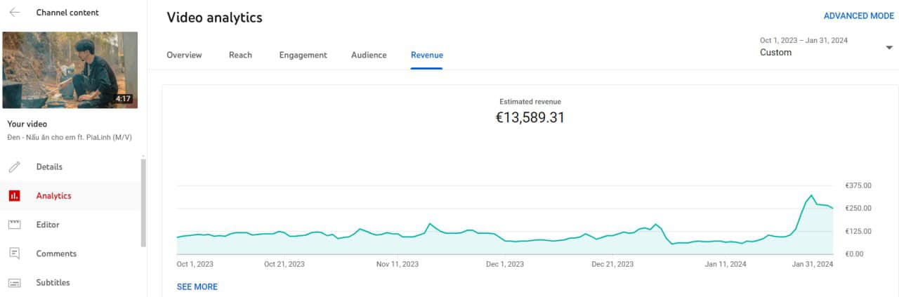 Cụ thể, từ ngày 1/10/2023 đến ngày 31/1/2024, sau khi trừ các chi phí, doanh thu kiếm được từ video của ca khúc này là 8.086 Euro, từ audio là 5.957 Euro.