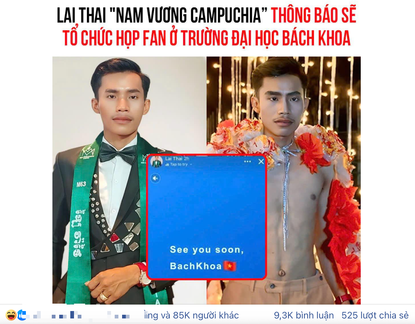 Trong những ngày gần đây, mạng xã hội Việt Nam xôn xao trước thông tin thí sinh Lai Thai của cuộc thi “Nam vương Campuchia 2025” sẽ đến Việt Nam và tổ chức buổi họp fan tại Đại học Bách khoa Hà Nội. Thông tin này nhanh chóng lan truyền trên các fanpage và nhóm cộng đồng, khiến nhiều người tò mò và chờ đợi sự xuất hiện của anh.