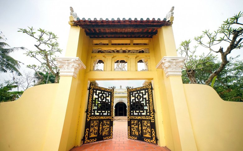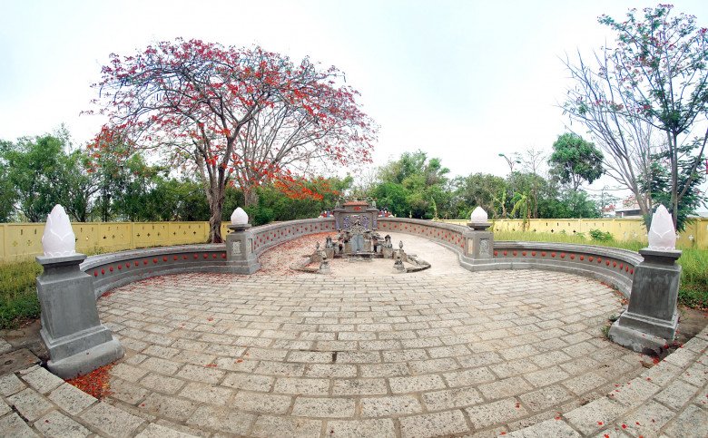 Theo quan sát, toàn bộ khu lăng mộ nằm trọn trong khuôn viên mát mẻ, có nhiều sứ đại cổ thụ, hoa lá cảnh vật bao bọc theo kiểu không gian nhà vườn xứ Huế. Cổng vào được xây theo lối tam quan cách điệu, trên mái lợp ngói lưu ly, đỉnh chạm trổ tượng cá chép trông trăng thể hiện sự cao quý của chủ nhân.