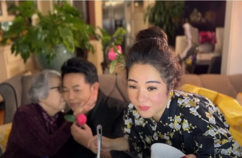Trong khi con gái và “con rể” sửa soạn cho phiên livestream, bà ra vườn ngắt 2 bông hoa vào tặng 2 người. Rồi cũng nhân khi con gái đứng lên múc yến, bà nhẹ nhàng thơm vào má anh. Bà không nói nhiều, chỉ bao nhiêu đó là đủ để thấy tình cảm “mẹ vợ” dành cho “con rể”. Thậm chí mẹ nữ danh hài còn nói với nam ca sĩ: “Con rước nó giùm bác!”