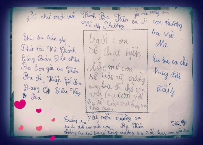Cà Pháo từng viết một bức thư tay gửi tặng ba Trung Kiên. Bức thư với những nét chữ còn nguệch ngoạc nhưng chan chứa tình cảm của cậu bé dành cho bố dượng.