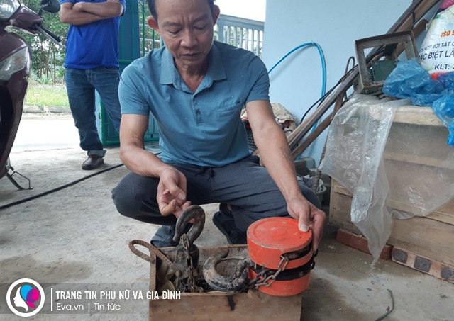 Ông Bẩy bên những dụng cụ gắn liền với công việc bốc mộ của mình bao gồm: dây sắt, cọc tời và bộ xích tời áo quan từ dưới lòng đất lên.