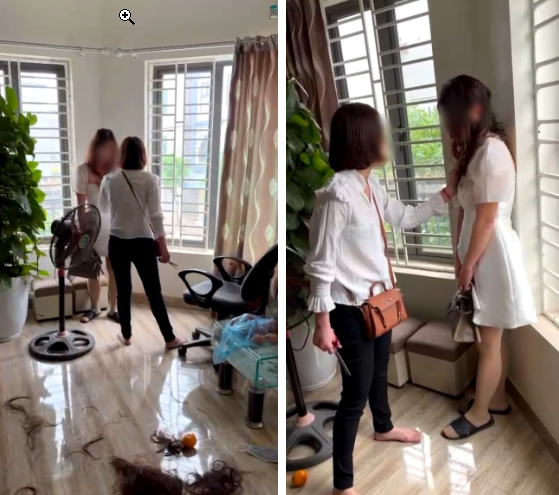 Trong một đoạn clip khác, người vợ giằng co, cầm kéo dọa xé váy, cắt váy của tiểu tam trong khi cô này đang khóc lóc vì sợ hãi, vừa xin lỗi vừa cố gắng ôm lấy chiếc váy. Trên sàn vương vãi rất nhiều tóc bị cắt được cho là của tiểu tam.