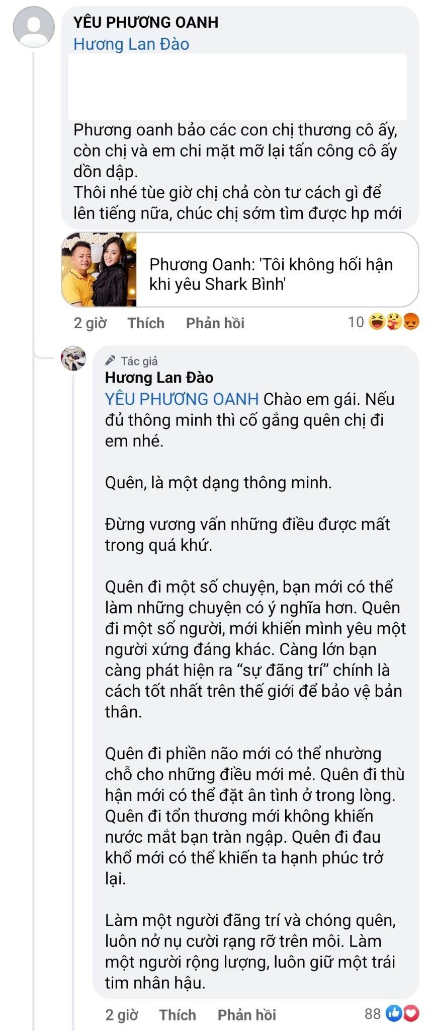 Bên cạnh đó, một cư dân mạng nhắc đến Phương Oanh và bình luận: “Phương Oanh bảo các con chị thương cô ấy, còn chị lại tấn công cô ấy dồn dập. Thôi nhé, từ giờ chị chả còn tư cách gì để lên tiếng nữa, chúc chị sớm tìm được hạnh phúc mới”. Trước bình luận này, Đào Lan Hương không bỏ qua và nhắn nhủ nhẹ nhàng, thâm thúy.