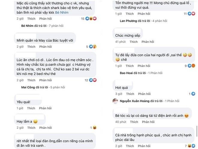 Dân mạng nhận xét: “2 con theo cô Oanh mẹ buồn sao”, “Vì mấy hôm nay từ chuyện cá koi mọi người cứ nhắc đến cá mập nên Bình đăng lên để chứng tỏ mình vẫn ok. Tưởng như vậy là ngon nhưng lại làm cho người khác thấy được sự dạy dỗ con tuyệt vời và sự vị tha của chị vợ. Dù sao đi nữa cũng là bố của con. Bình mất điểm trầm trọng mà cứ nghĩ mình hay”, “Không hiểu sao mình ngoài cuộc nhìn ảnh này vẫn xót xa, 1 cảm giác khó tả, và mong tất cả các thành viên trong cuộc đều happy an nhiên tận sâu thẳm. Bởi vì kết cũng là khởi… vạn sự đều nghiệp duyên nhân duyên rồi hữu duyên”, “Thực tế thì không một người mẹ nào muốn con mình ngồi chung với bồ của chồng cũ”, “Mặc dù cũng thấy xót thương cho chị vợ, nhưng thú thật là thích cách shark bảo vệ tình yêu quá, bản lĩnh nó phải vậy”, “Nếu anh không đăng các con anh cùng mẹ ruột của chúng trong một khung hình thì cũng không nên đăng bức ảnh này anh ạ. Chê anh!”uhj