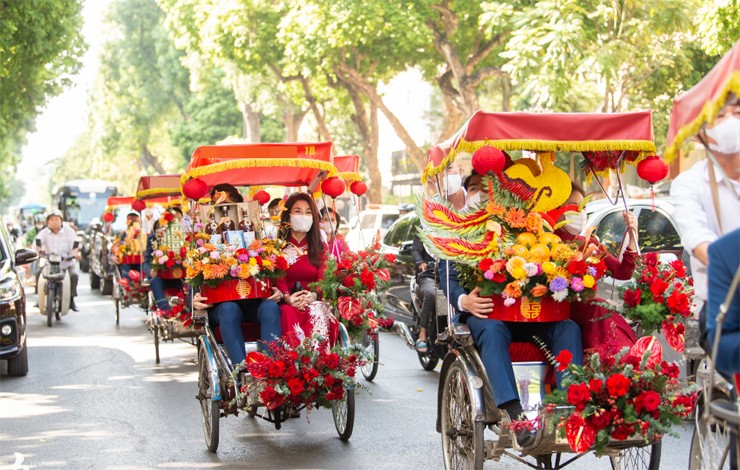 Dàn bê tráp hoành tráng tiến về nhà gái trên những chiếc xích lô quen thuộc với những lễ ăn hỏi truyền thống của người Việt. Bởi lẽ khoảng cách giữa nhà cô dâu và chú rể không quá xa nên việc chọn lựa xích lô là điều dễ hiểu.