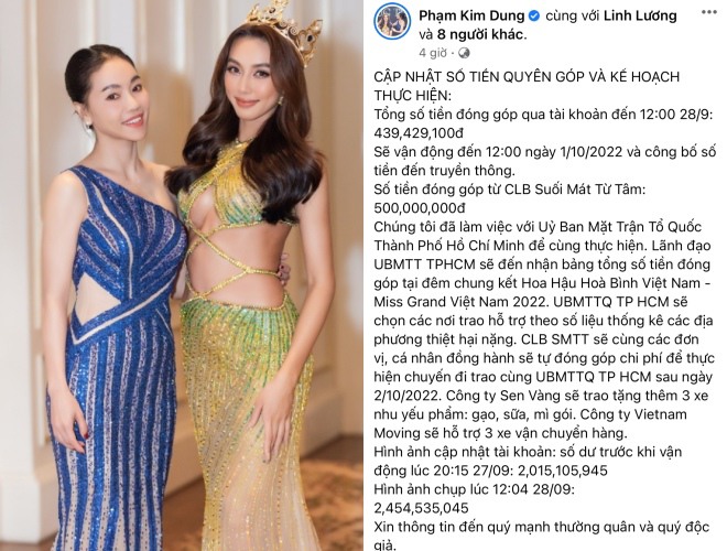 Phía bà Phạm Kim Dung, chủ tịch Miss Grand Vietnam 2022 cũng vừa cập nhật thông tin mới nhất, cho biết đã nhận được hơn 439 triệu đồng từ các mạnh thường quân. Bà tiết lộ sẽ công bố con số chính xác vào ngày 1/10 tới. Ngoài ra, phía câu lạc bộ thiện nguyện do bà quản lý cũng đóng góp số tiền 500 triệu đồng. Bà Kim Dung khẳng định sẽ trực tiếp tổng kết, sau đó làm việc với Ủy ban Mặt trận Tổ quốc TP.HCM và các lãnh đạo để triển khai giúp đỡ ở những địa phương đang chịu thiệt hại nặng nề.
