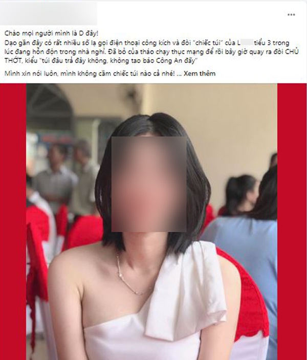 Chưa dừng ở đó, sau khi đánh ghen xong, D. liên tục nhận được cuộc gọi lạ. Ban đầu họ gửi lời xin lỗi đến cô nàng, sau đó muốn xin lại chiếc túi xách của tiểu tam (bị bỏ quên tại nhà nghỉ trong lần bị đánh ghen, nhưng cô không hề lấy – PV). Khi cô khẳng định mình không biết túi xách ở đâu, họ liền dọa nạt nói sẽ đưa ra công an làm rõ.
