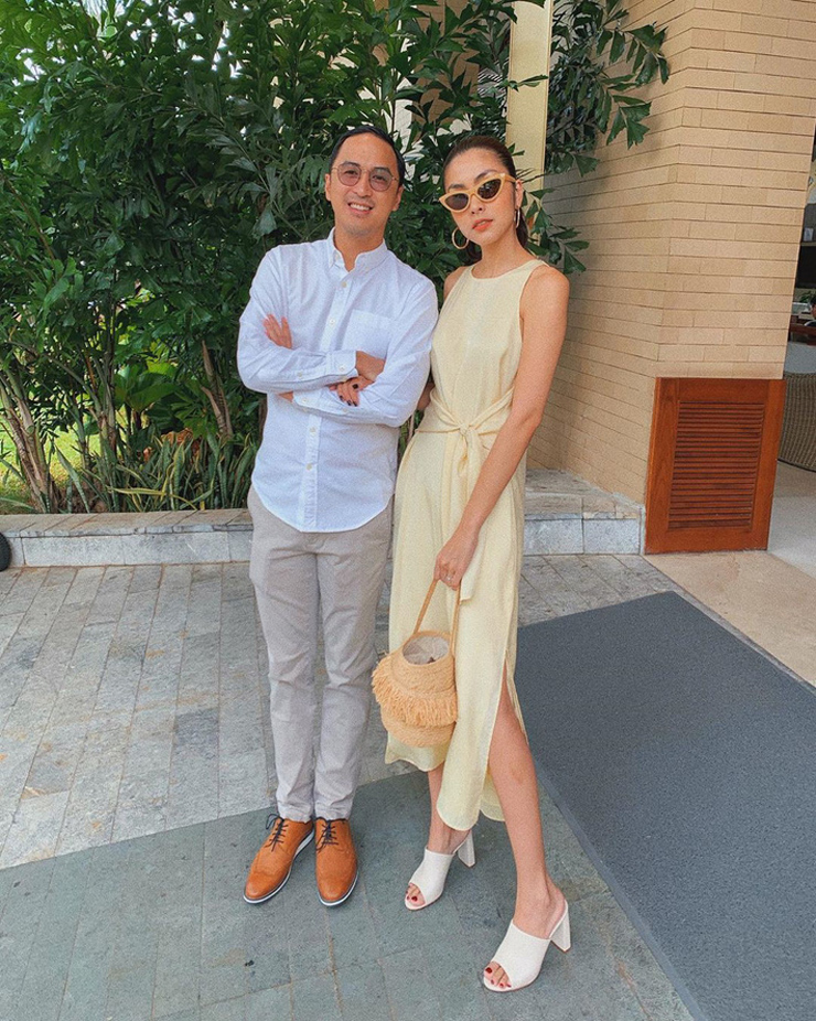 Lên đồ đi đám cưới cùng chồng, Hà Tăng ăn diện đơn giản mà trang nhã.