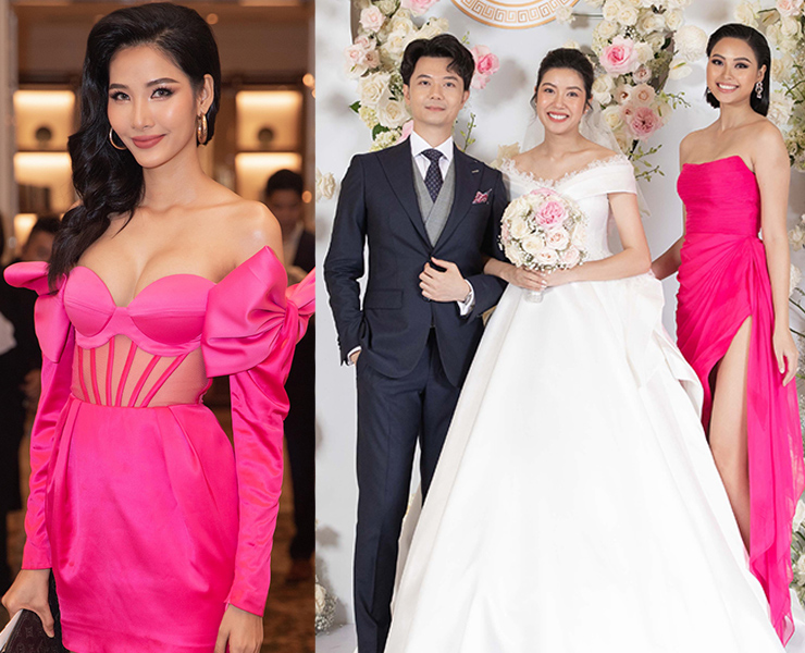 Top 5 Hoa hậu Hoàn vũ Việt Nam 2019 Đào Thị Hà và người mẫu Hoàng Thùy (trái) diện trang phục bắt mắt tại đám cưới Á hậu Thúy Vân năm 2020.