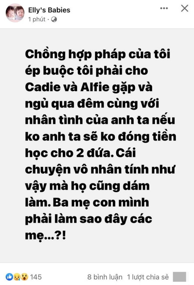 Elly Trần khiến mọi người bàng hoàng khi viết: “Chồng hợp pháp của tôi ép buộc tôi phải cho Cadie và Alfie gặp và ngủ lại cùng với nhân tình của anh ta nếu không anh ta sẽ không đóng tiền học cho 2 đứa. Cái chuyện vô nhân tính như vậy mà họ cũng dám làm. 3 mẹ con mình phải làm sao đây các mẹ?”.