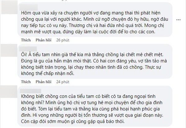 Thành viên N.H bình luận: “Ôi! Ả tiểu tam nhìn già thế kia mà thằng chồng lại chết mê chết mệt. Đúng là gu của hắn mặn mòi thật. Có hai con đáng yêu, vợ tần tảo mà không biết trân trọng, lại chạy theo nhân tình đã có chồng. Thực sự không thể chấp nhận nổi”.